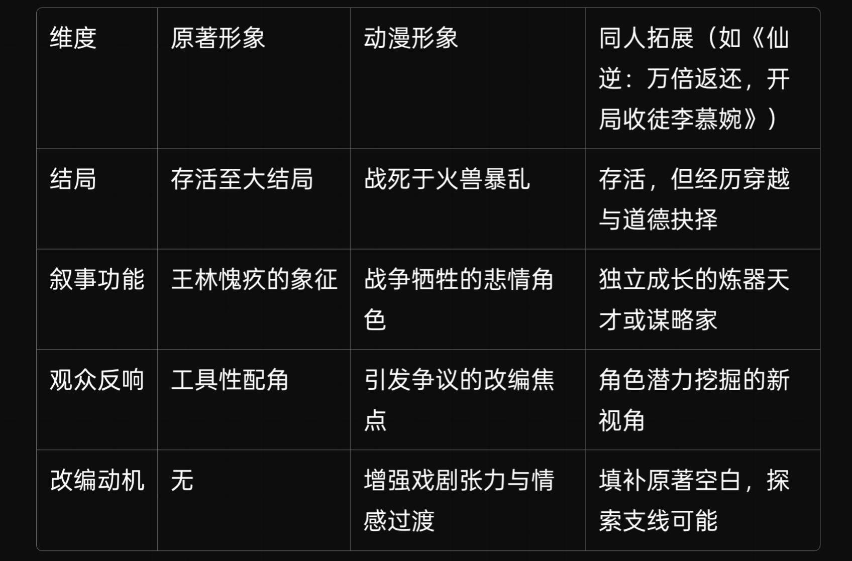 - 动漫改编:为增强戏剧冲突,导演安排李奇庆死于火兽暴乱。此改编引发争议,但旨在通过牺牲角色强化战争残酷性,并推动王林接替其守护李慕婉的叙事功能。